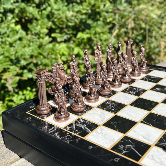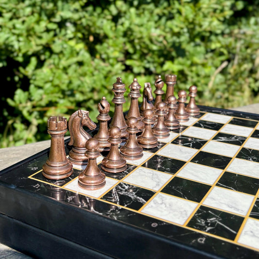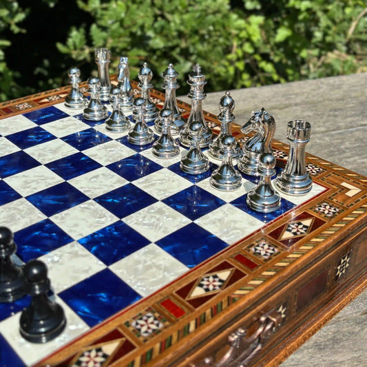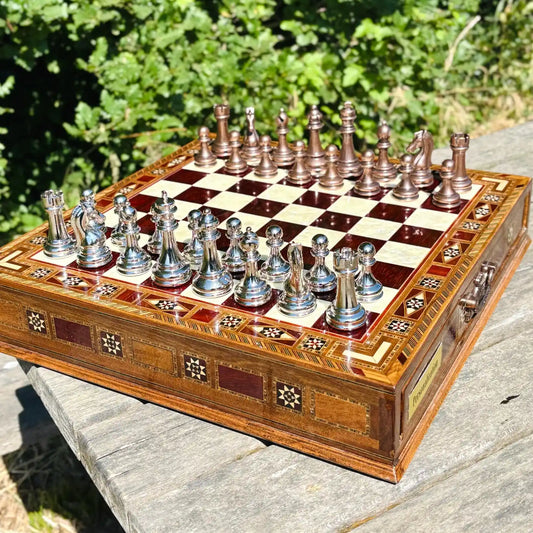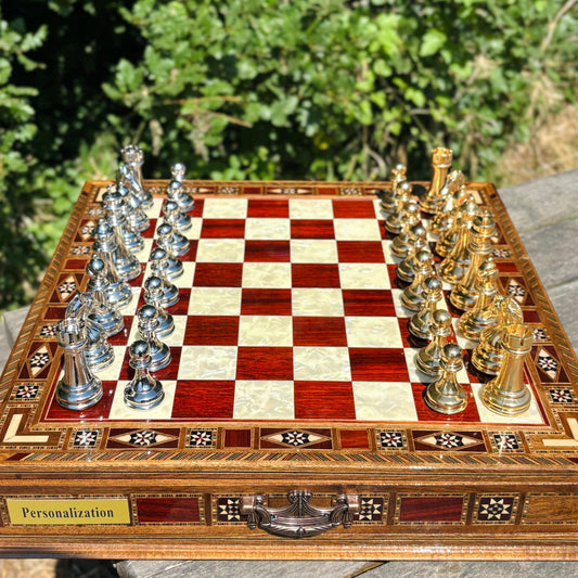 Handmade Luxury Chess Set – Personalized Wooden Board with Storage – Metal Chess Pieces – Unique Gift for Him
